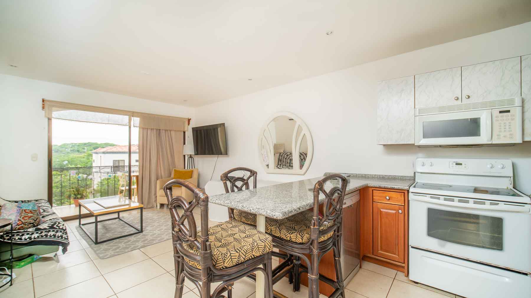 La cocina de concepto abierto y el área de estar se extienden armoniosamente hacia un balcón privado enmarcado por palmeras exuberantes y con vista a una piscina de estilo resort, creando un ambiente acogedor para tomar café por la mañana o cenar al atardecer.