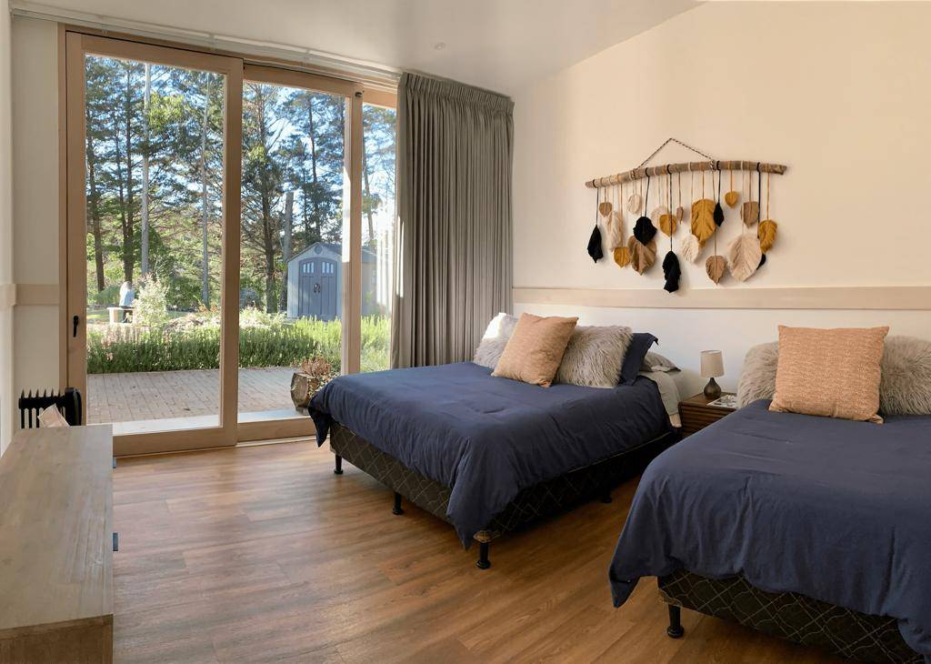 Master bedroom con cama queen. Secundaria con 2 camas, queen e individual.