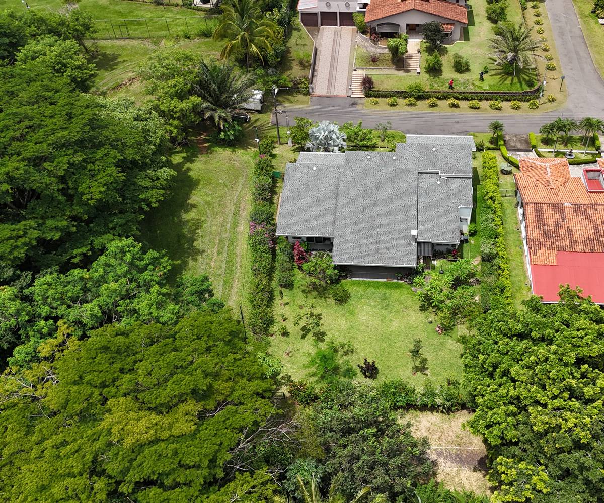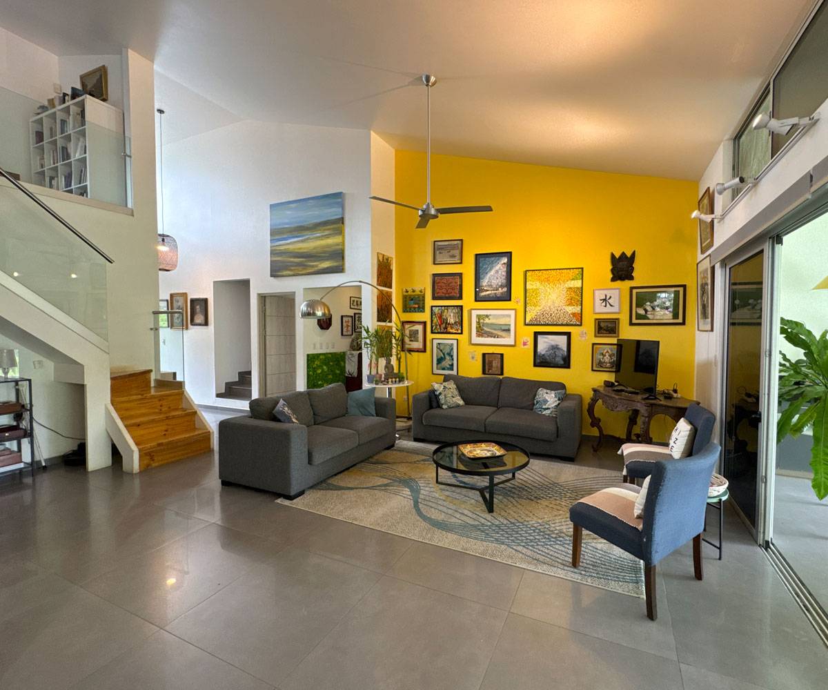 El área social tiene doble altura e integra los espacios de sala, comedor y cocina. Toda esta área está anexa a la gran terraza que da al gran jardín que es completamente plano y se encuentra todo en verde. Por medio de este jardín también se puede acceder al sendero y al parque del residencial los cuales cuentan con muchos árboles lo cual brinda mucha más frescura y privacidad ya que te ahorras un vecino lateral (a un costado colinda con el parque) y el vecino trasero está separado a varios metros gracias al sendero del residencial, por lo tanto esta casa ofrece aún más privacidad de lo normal en Los Reyes.