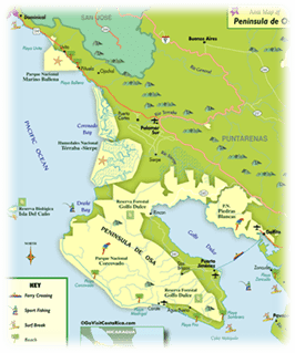 - Acceso por carretera pública, por río navegable (Río Sierpe) o vía aérea mediante aeropuertos cercanos (Puerto Jiménez, Palmar Sur y próximamente el Aeropuerto Internacional de Sierpe).