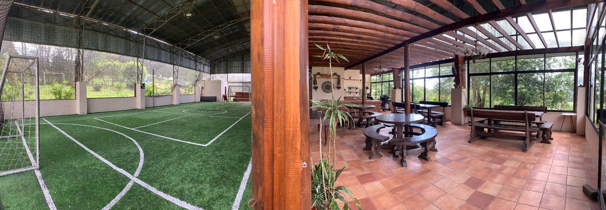 - Cancha techada de césped sintético para fútbol 5, bádminton o pádel rústico.