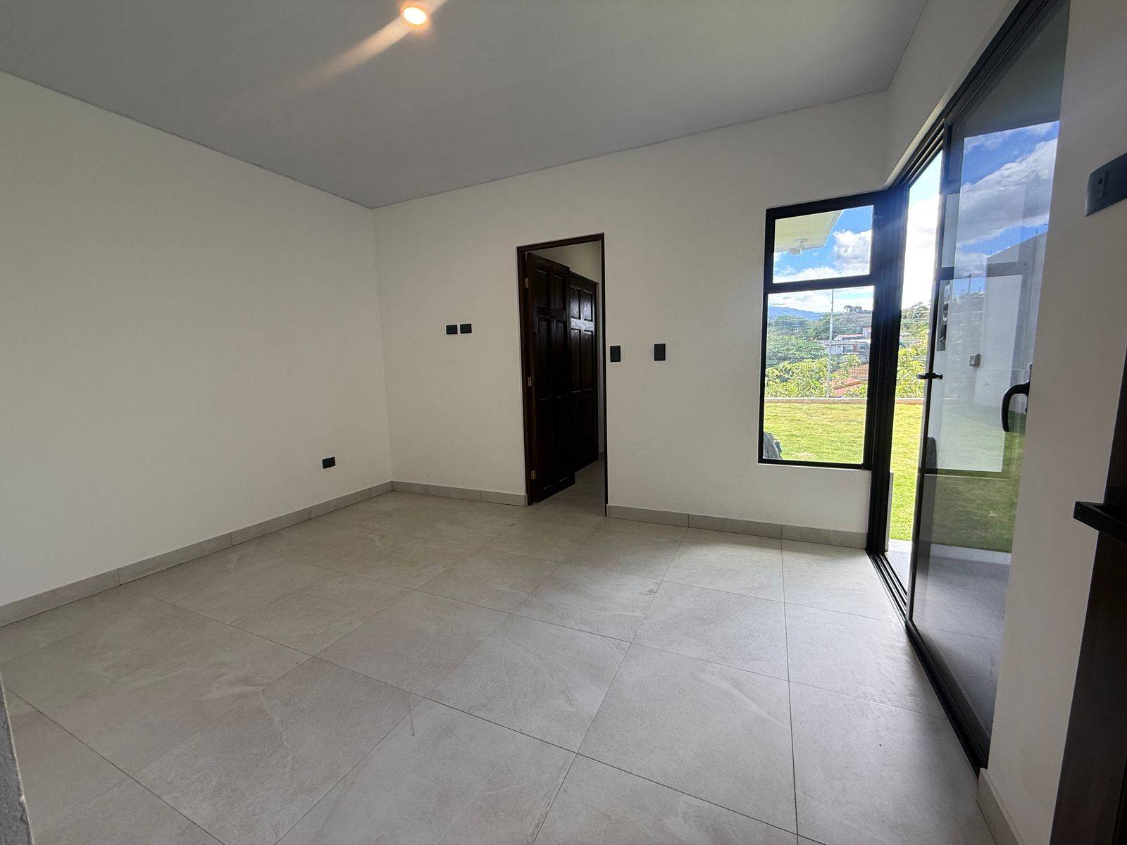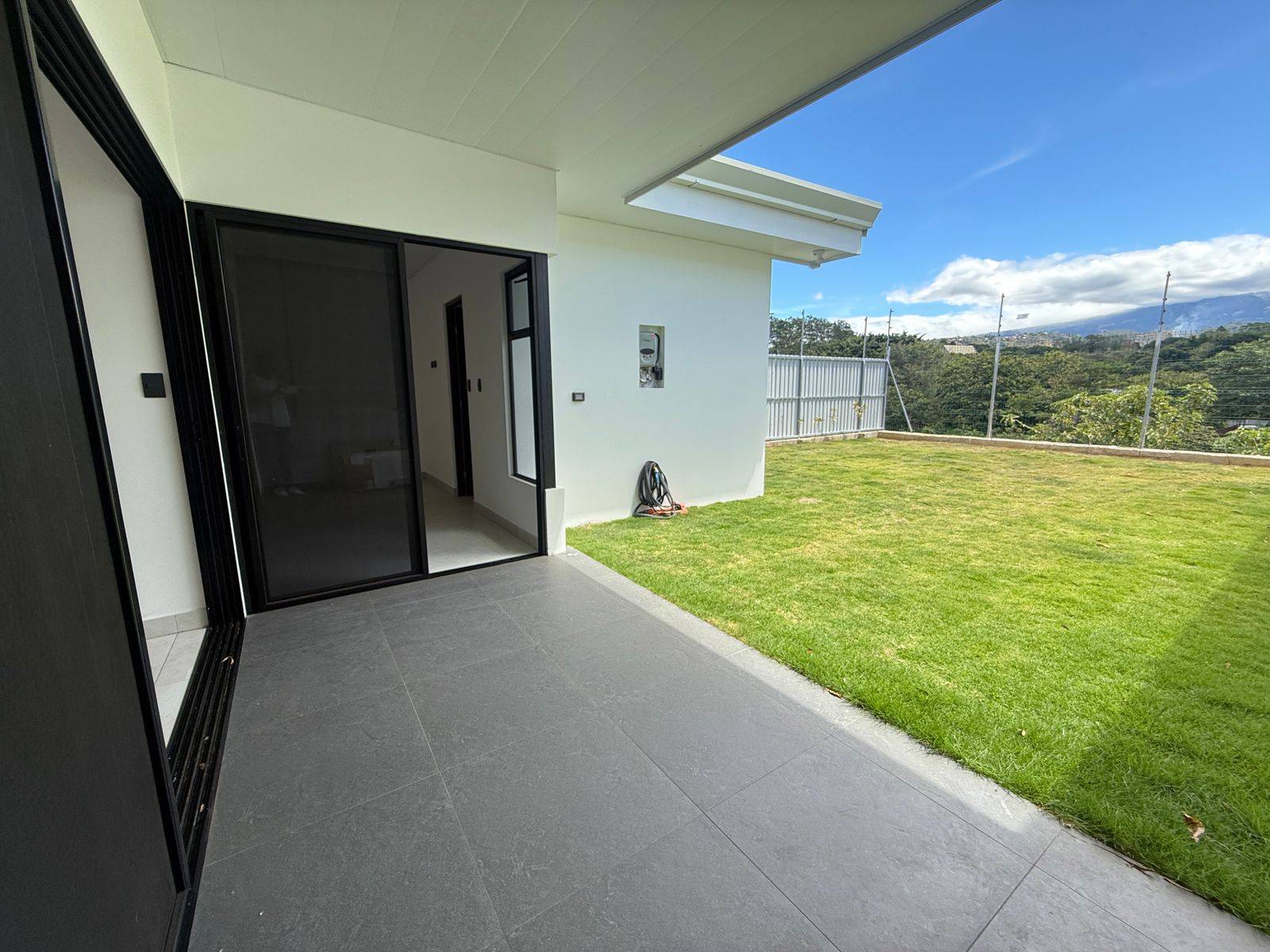 Puertas corredizas que conectan la sala con una terraza acogedora y un amplio patio verde