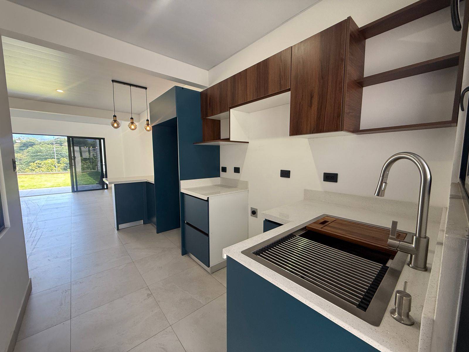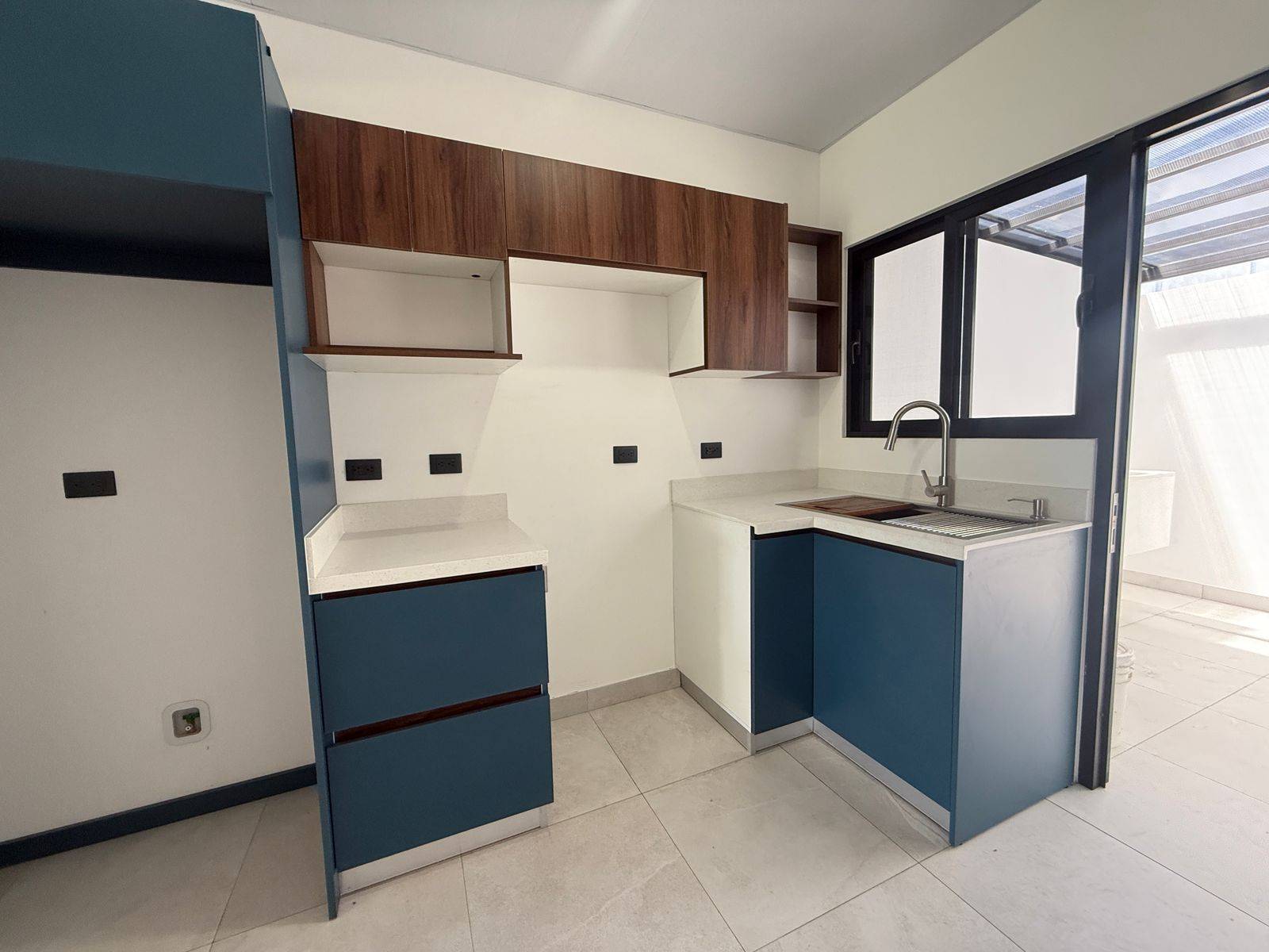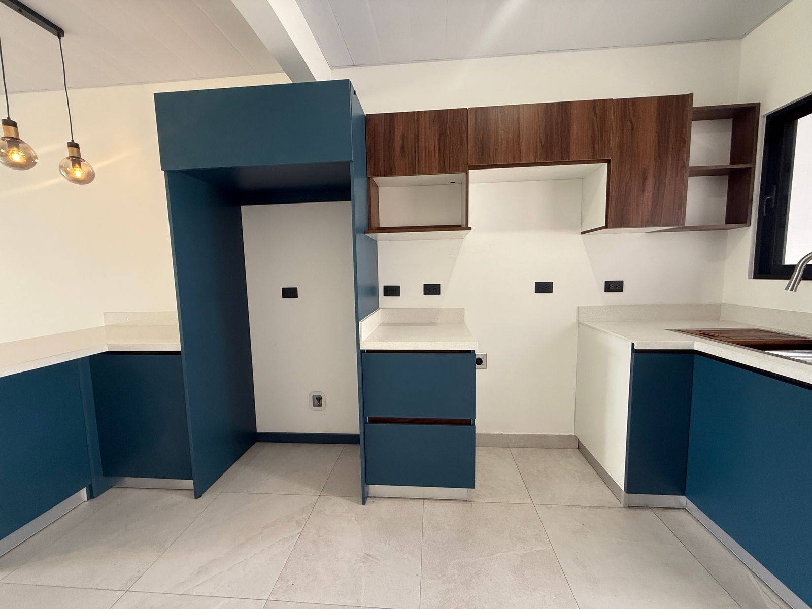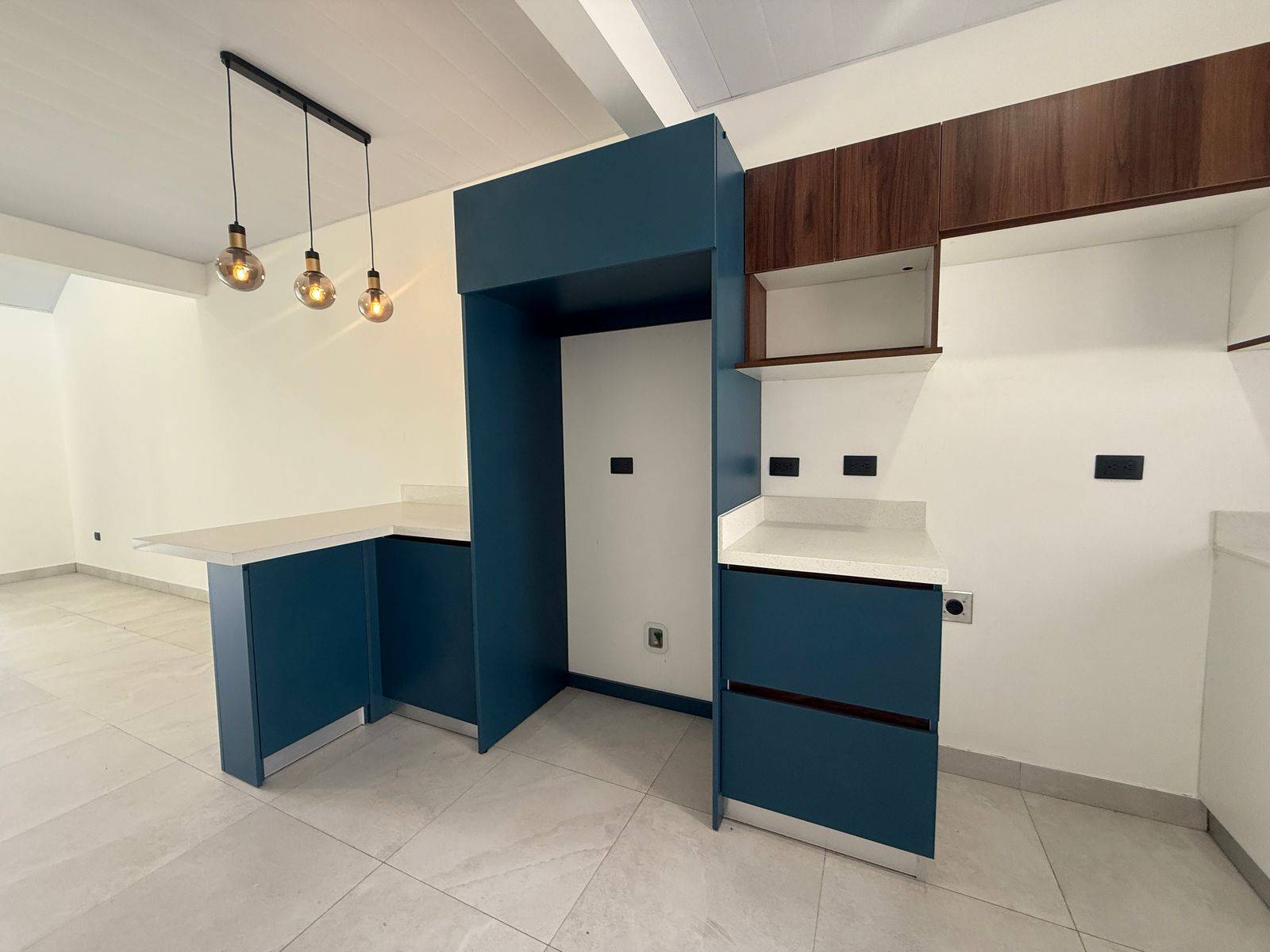 Cocina equipada con muebles en melamina y sobres en cuarzo